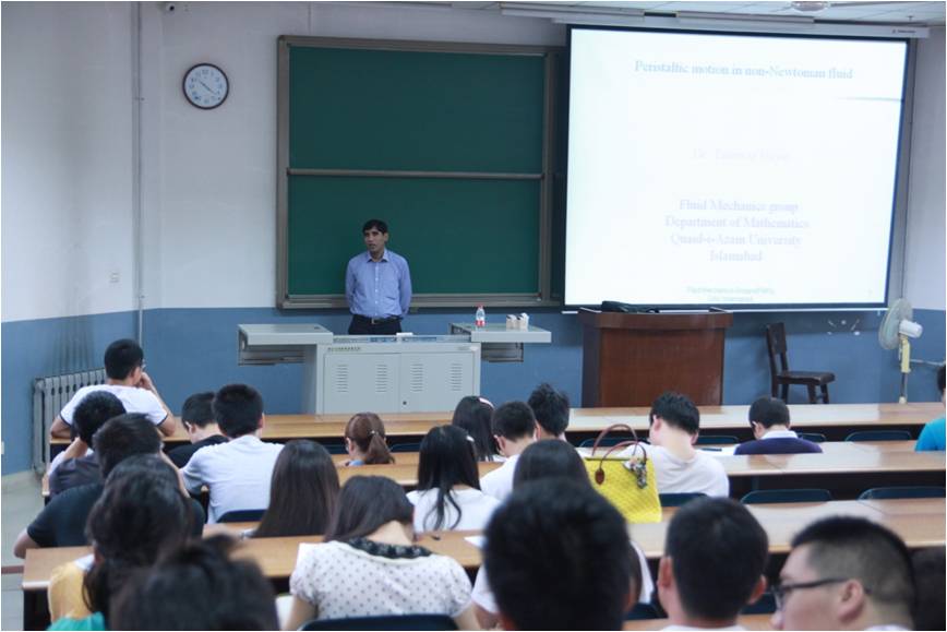 9月5日上午, Hayat教授在北校区阶梯教室J-508为我校师生做了题为“Peristaltic Motion of a Magnetohydrodynamic Generalized Second-Order Fluid in an Asymmetric Channel”的精彩报告,机电工程学院150余名师生参加了报告会。