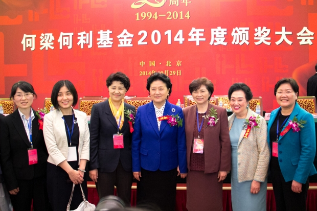 中共中央政治局委员、国务院副总理刘延东(中)和何梁何利基金募捐人代表梁洁华(右二)与2014年度部分获奖人合影