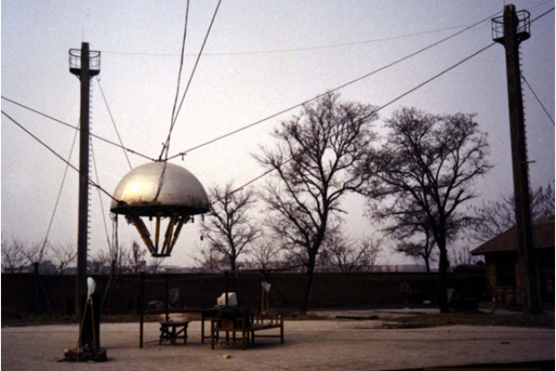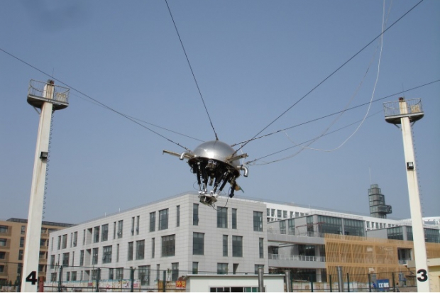 第二个模型是在中国科学院知识创新工程重大项目支持下进行的,位于西安市南郊的沙井村,是一个1:10比例的50米室外模型。在这一模型中,6个支撑塔的高度为15米,均匀分布在直径50米的圆上,馈源舱为直径2.5米的半球。实验中为了抑制振动,这一模型对6悬索并联系统方案还做了微调,增加了2根向下拉的悬索。