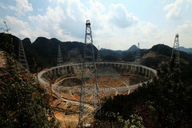 根据资料显示,FAST选择在贵州南部喀斯特地形中一个500米级的球形洼地中建造,洼地内铺设主动反射面。建成后的工作原理是,被馈源照明部分的球形反射面,可实时地调整为一个抛物面,从而可用传统的抛物面望远镜的馈源照明技术来实现宽带观测。