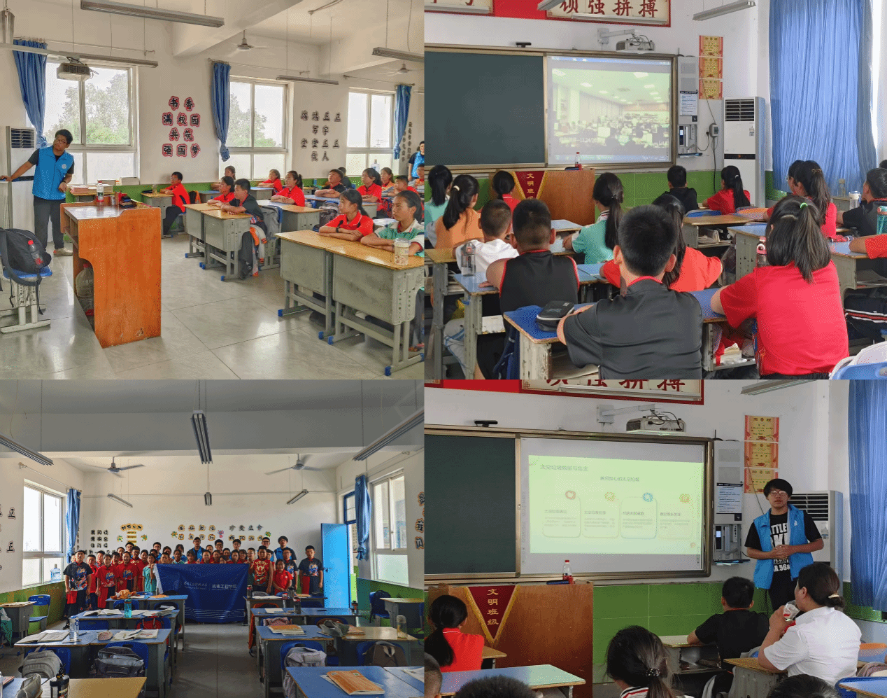 青春课堂续薪火,齐筑乡村科技梦想。在开展座谈会的同时,学院机器人工程专业学生来到教室,为同学们带来了别开生面的科技课堂,以专业知识分享激发学生对科技的探索热情。张佳硕同学以“IRobot机器人战队的发展与创新实践”为主题,从高校机器人社团发展的独特视角切入,讲述了3499cc拉斯维加斯IRobot机器人战队的成长历程,并以RoboMaster机甲大师赛参赛的机器人为例子,讲解了机器人运作的基本原理。李卓键同学以“太空垃圾清理”为主题,介绍了目前主流的太空垃圾清理方式和原理,并讲述了电动帆拖曳系统的创新性。两位同学带来的讲解,让孩子们对未来科技发展充满憧憬,极大地激发了他们的求知欲与创新精神。