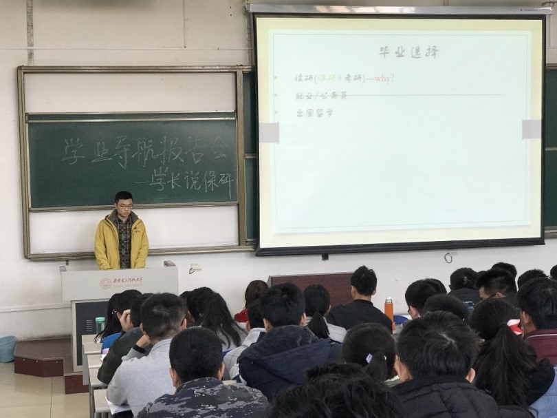 吉斌学长特别强调了基础学科的重要性,激励大家从一开始就重视学习,在学习上做到从被动变主动、兴趣加坚持,并细致地介绍了保研成绩的计算方法以及竞赛情况,以自己的亲身经历给大家提供了指导;徐明坤学长就保研面试时间安排和遇到的问题与大家进行了深入的交流,介绍了合理的规划策略以及在大三时如何兼顾保研和学业,还以自己参加夏令营以及与导师交流的经历为例讲解了推免的注意事项;程坤学长向大家介绍了本专业的主要参考院校和研究所,提供了明确的方向,并建议大家一定做到合理安排时间,积极发言锻炼自己,让自己在面试时更加自信。