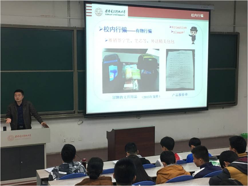 首先,魏老师从校内行骗讲起。从有物行骗——如冒充商家向学生推销冒牌签字笔、笔芯,到无物行骗——如冒充境外大学生借钱或者直接开口要钱,魏老师通过多个生动的案例给同学们讲解了各式各样的行骗手法,引发了同学们的深刻反思。