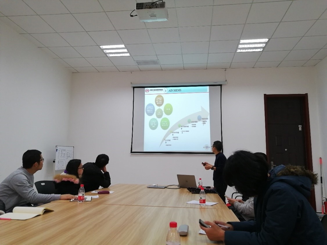 高杨研究员主要从AIN MEMS、RF MEMS和Aero MEMS三个方面,介绍了团队近年来在军民两用MEMS器件领域的工作,报告内容深入浅出,异彩纷呈。高杨研究员先后介绍了AlN MEMS的BAW(体声波)射频无源器件(谐振器、滤波器、双工器)、BAW传感器(加速度计、伽马辐照探测器)、AlN MEMS传感器(DETF谐振式加速度计);RF MEMS的SIW和微带线无源器件工艺改进、交指滤波器与双工器设计、电容式开关的故障物理研究以及两种Aero MEMS器件的一些实践。报告详细讲解了各类器件的设计理念与实验研究,及相关工艺流程,体现了研究成果在军民两用领域的可靠性和实用性。此次报告引起了与会师生浓厚的兴趣,报告结束后,大家积极讨论交流,高杨研究员针对师生提出的问题做了详细的解答。