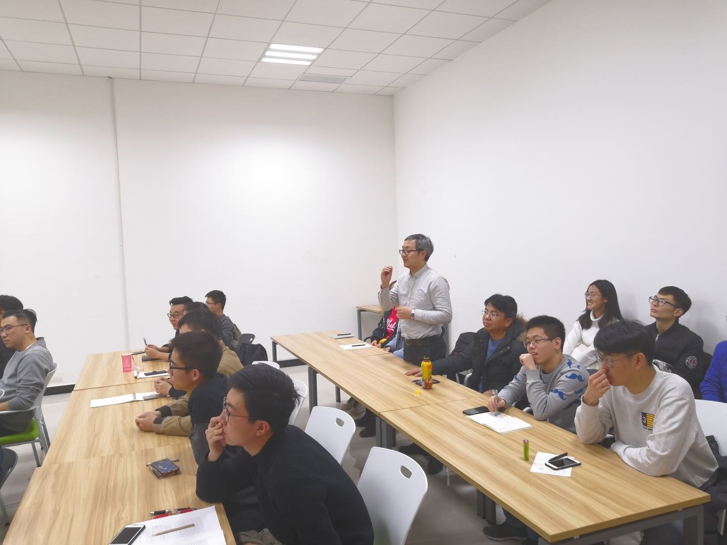 多机器人集群是将大量简单机器人组成的系统进行协调控制的方法。通过多机器人之间和机器人与环境之间的交互,给出一个期望的集群行为,社会群体中也经常涌现此类行为,即所谓的群体智能。林教授本次报告主要讲述了几类多机器人集群控制方法。通过建立系统的常数反馈,探索了群体中信息的传递方式,仅使用局部通信与传感,采用相对简单的个体交互规则可以产生大量的复杂群体行为。林教授报告结束后,与师生们进行了热烈的讨论与交流,针对大家提出的问题,给出了详细的回答。