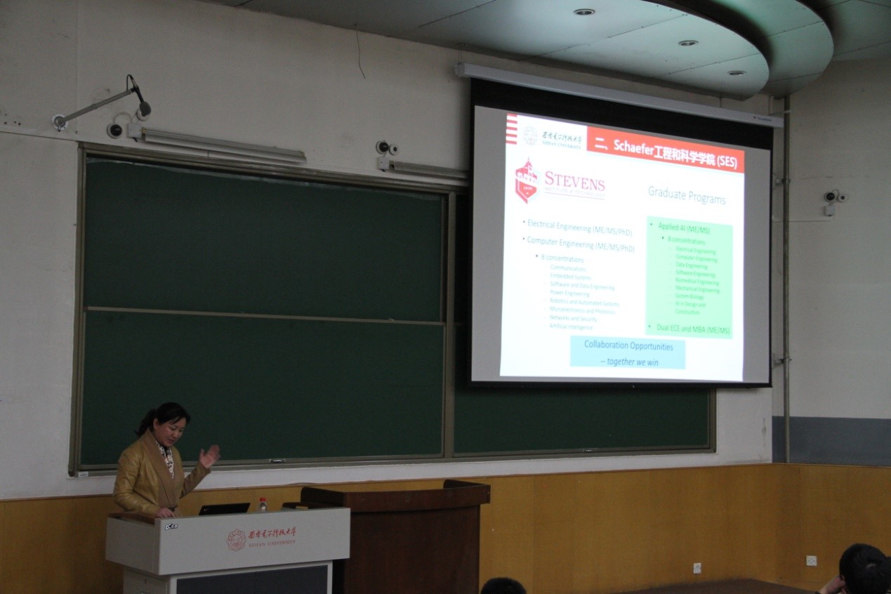 马娟教授从历史发展、学校优势、院系设置、师资排名、毕业生声誉等方面介绍了美国斯蒂文斯理工学院(SIT)及Schaefer工程和科学学院 (SES) 的情况,然后详细讲解了西电-斯美国蒂文斯理工学院“1+2”双硕士学位联培项目的立项宗旨、创建过程、联培方式、学费奖学金及申请条件,呼吁与会学生珍惜来之不易的留学机会并现场对学生关注的合作办学问题进行了电子问卷调查。