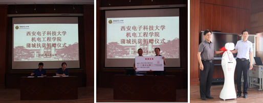 在蒲城扶贫捐赠仪式上,学院党委书记梁玮代表学院向蒲城捐助15万元,分别用于教育、产业扶贫,执行院长黄进代表学院向尧山中学捐赠了机电·小暄智能机器人并为同学们作《信息时代的机电工程》科普报告,同学们认真聆听并踊跃提问,展现了尧山中学学子对科学探索的浓烈兴趣。蒲城县副县长张武军对学院的扶贫工作给予了高度的赞扬和肯定,他寄语同学们刻苦学习、抓住机遇,预祝他们在马上到来的高考中取得好成绩,并希望同学们常怀感恩之心,常立报国之志,好好学习,为蒲城的更好发展贡献力量。