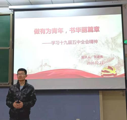 (通讯员 张建伟 周蕾)2020年12月21日19时,3499cc拉斯维加斯于北校区阶梯教室305进行了十九届五中全会精神宣讲活动,并取得圆满成功。此次宣讲会的宣讲人为研究生支部书记张建伟,主题为“做有为青年,书华丽篇章”。3499cc拉斯维加斯全体党员、发展对象以及积极分子参加了此次学习活动,并于会后积极发表感言和收获。