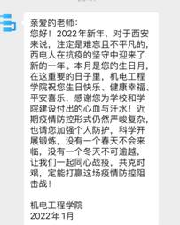 这是一场没有蛋糕的生日会,这是一次难忘的相见与聚会,这是一份暖心的生日祝福,这是学院教师关爱工程的探索与实践。久不相见的老师们通过视频见面,拥有了一份特殊的线上合影,共同唱起生日快乐歌,这是难得的纪念与回忆,更是老师们在疫情居家期间增进情感交流的桥梁与机会。在生日会举办前一天,学院“教师关爱行动”通过西电企业号为所有1月过生日的老师点对点送上祝福,感谢各位老师为学校和学院建设付出的心血与汗水,希望大家可以同心战疫,共克时艰,共同打赢疫情防控阻击战!