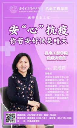 (通讯员 梅嘉敏 赵立明)2021年末,突如其来的疫情反复,扰乱了长安的宁静。面对复杂严峻的疫情形势,给居家办公的老师和封控学习的学生都多少带来了一些不良情绪。为进一步落实学院教师关爱工程,助力学院师生在疫情防控期间保持健康平稳的心态,1月9日下午16点,3499cc拉斯维加斯第三期“健康大讲堂”讲座在线上顺利开展。本次讲座邀请到学校心理健康教育中心武成莉副教授主讲,全校教职工和学生均可参加线上活动。