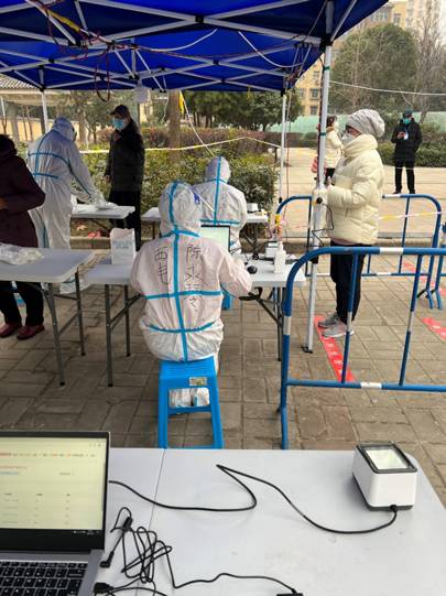 在核酸采样点服务时,社区居民看到她的防护服上的“西电”两个字,问到:“您是西电老师?”“是的,我也是西苑家属”。