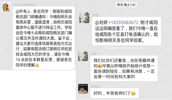 在同学们安全顺利离校返家的背后,我们看到了一线工作人员通宵达旦的坚守与奋战。看到了学院辅导员以及班长在班级群里及时发布学校通知,统计信息、通知离校返家注意事项。他们还逐一敲开学生宿舍的门发放需要的证明材料,并嘱咐同学们“到家的第一时间就给我发信息,路途中不管遇到任何问题,都要第一时间和我联系,学校和老师会尽全力帮助大家解决遇到的问题!”