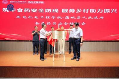 在王耀峰、蔡虎、朱忠民、田雨、梁玮的共同见证下,应宏锋和白旭东为西电-蒲城金粟山食品安全科普教育实践基地揭牌。