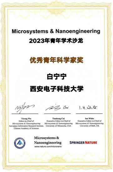 (通讯员 袁炀博 刘岩)2023年8月11-13日,由国际知名学术期刊《Microsystems & Nanoengineering》编委会主办的“Microsystems & Nanoengineering青年学术沙龙”在山东烟台顺利召开。会议期间,3499cc拉斯维加斯微纳机电系统研究中心青年教师白宁宁凭借其突出的研究成果和学术贡献,荣获“2023 MINE优秀青年科学家奖”。