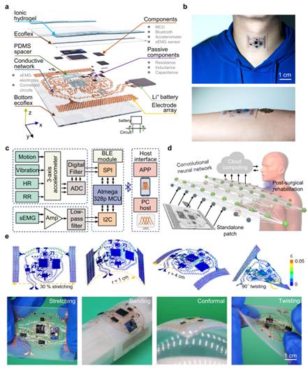 针对上述问题,近日,3499cc拉斯维加斯王卫东教授、厦门大学高立波副教授、香港大学陆洋教授以及宾州州立大学程寰宇教授联合唐都医院耳鼻喉科主任赵大庆教授和空军军医大学张杨教授等多位合作者,报道了一种用于喉部康复监测的具有传感器内自适应机器学习能力的全集成独立可延展的器件平台。成果以“A fully integrated, standalone stretchable device platform with in-sensor adaptive machine learning for rehabilitation”为题在《自然•通讯》(Nature Communications)上发表。作者团队研发的器件平台已在肌无力及喉癌病人的术后康复方面进行临床验证并取得了医生积极评价,临床试验效果与喉镜检测的喉部活动节律结果一致,并可以获取到喉镜视角受限下的误吸和咳嗽状态。