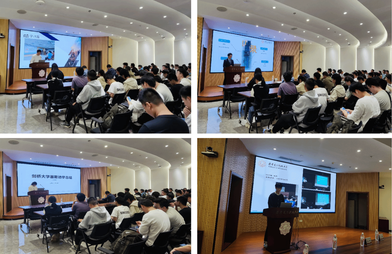 接下来四位参与暑期国际交流的学生代表分享了他们的访学体验。陈硕从学习和文化两方面讲述他在马来西亚拉曼大学夏令营的经历,包括在研究所参观、小组交流、反转课堂一系列活动;李畇帛从所学、所见、所感来讲述新加坡南洋理工大学的学习之旅,不仅有对科研领域的更全面认识,还充分体验了当地的美景美食;施承均讲述他在日本早稻田大学的交流经历,讲述遇到的文化碰撞、饮食差异等;符淑茗分享她英国剑桥大学的交流经历,参观了当地著名建筑并分享自己的心得感受。四位同学的国际交流经历各不相同,但都表示收获很多,都体会到了不同国家在文化、饮食、政治等方面的差异,体会到了自己作为大学生的身份责任,并在访学过程中充分激发了自身的科研热情。