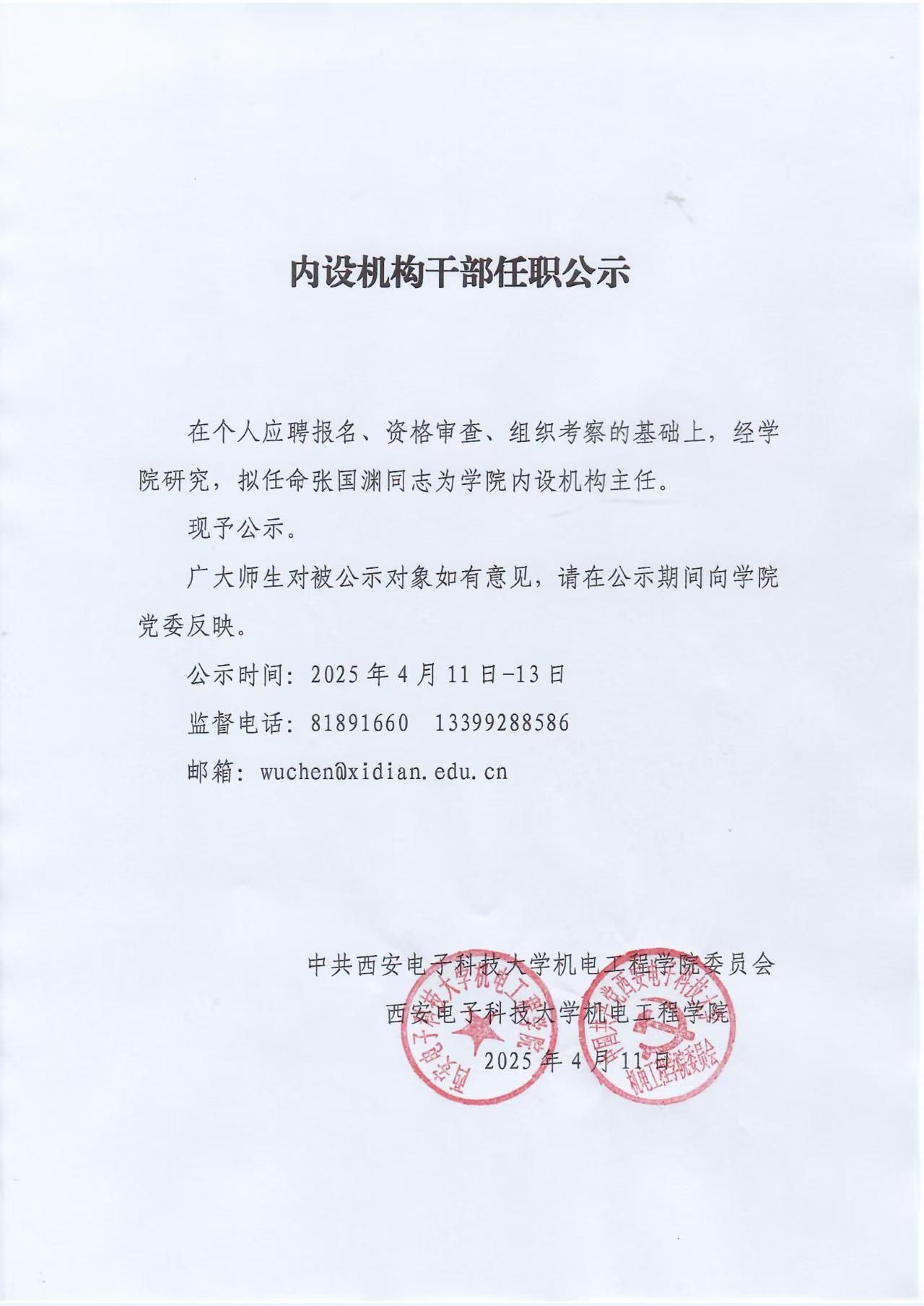 内设机构干部任职公示