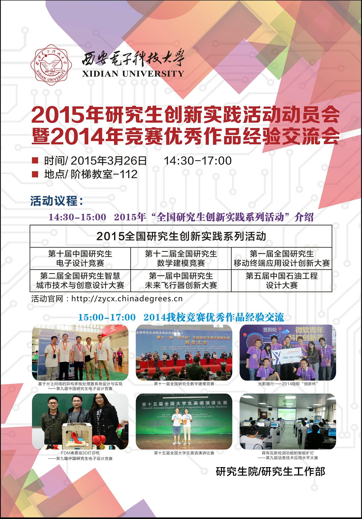 阶梯教室112召开“3499cc拉斯维加斯2015年研究生创新实践活动动员会暨2014年竞赛优秀作品经验交流会”。届时,将向大家介绍2015年研究生创新实践活动六大赛事的具体情况,并由 2014年度竞赛获奖优秀队伍介绍参赛经验。