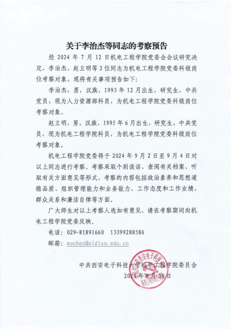 关于李治杰等同志的考察预告
