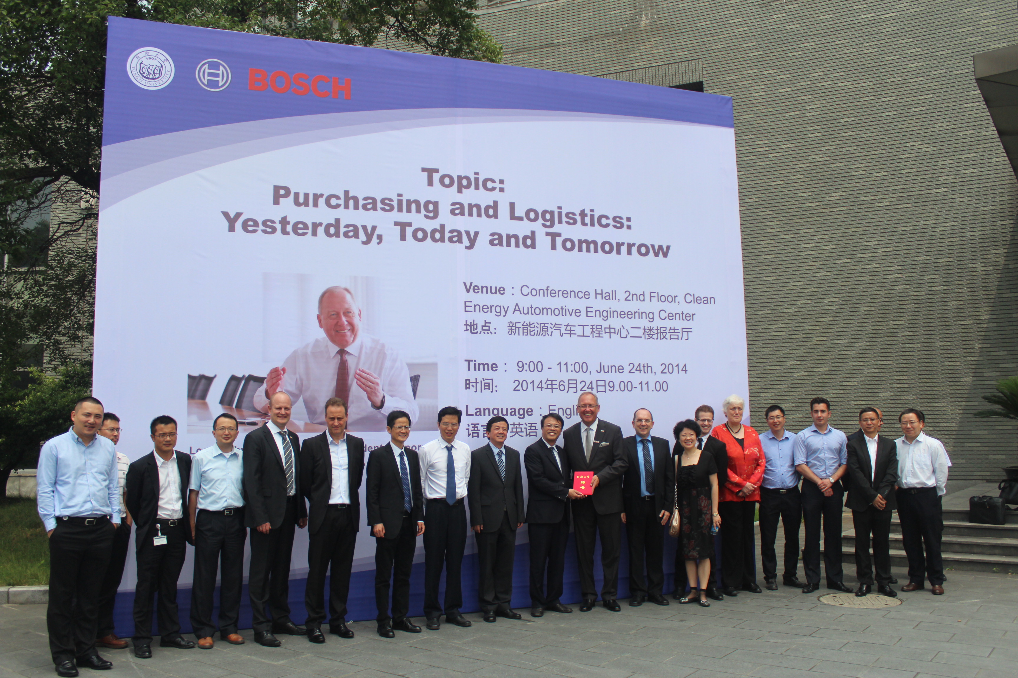 2014年6月24日上午,Bosch全球物流采购总裁Dr. Karl Nowak一行来到同济大学汽车学院,在新能源汽车工程中心二楼报告厅举行兼职教授授证仪式暨讲座,主题为“Purchasing and Logistics: Yesterday, Today and Tomorrow”。同济大学校长助理、汽车学院院长余卓平教授、汽车学院副院长魏学哲教授、中德学院副院长Otte女士和中德学院副院长吴志红教授出席了活动。