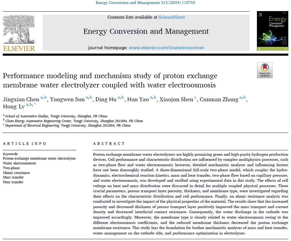 7月3日,Elsevier旗下高影响力综合期刊 《Energy Conversion and Management》(IF=9.9, Cite Score=19.0)在线发表了题为“Performance modeling and mechanism study of proton exchange membrane water electrolyzer coupled with water electroosmosis”的研究性论文。该研究主要由同济大学汽车学院张存满教授团队完成,博士研究生陈静娴为论文第一作者,吕洪副教授为通讯作者。