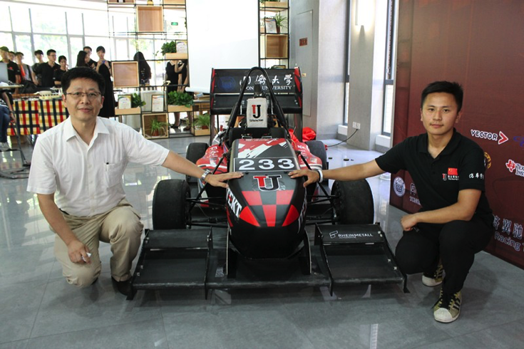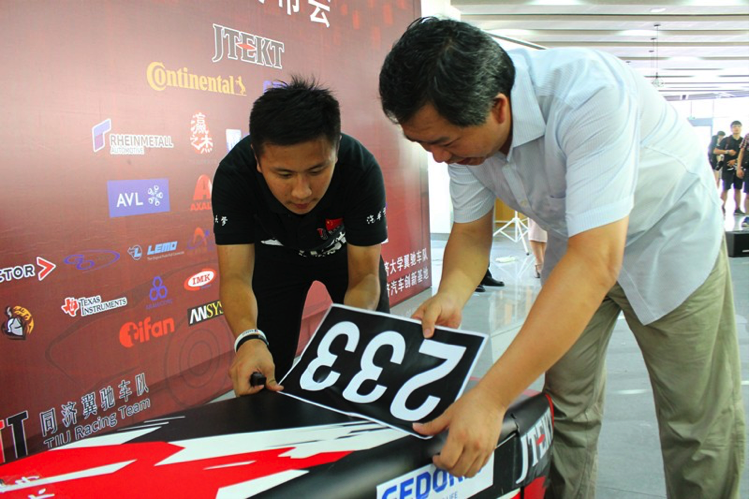 同济大学党委学研工部副部长宋木生老师为新车贴上同济大学的logo,TR17定将不辱使命,为校争得荣光。