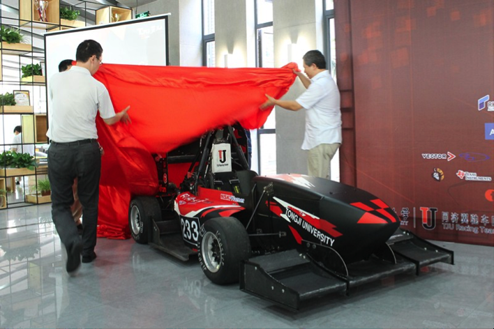 在回顾完九辆赛车之后,由FSC大赛组委会副秘书长高华老师、同济大学党委学研工部副部长宋木生老师、同济大学汽车学院副院长钟再敏老师以及车队总指导老师李理光教授为新车TR17揭幕。