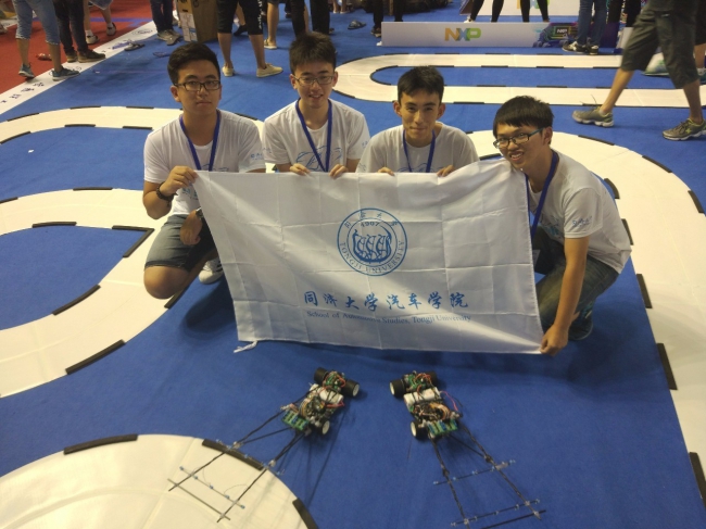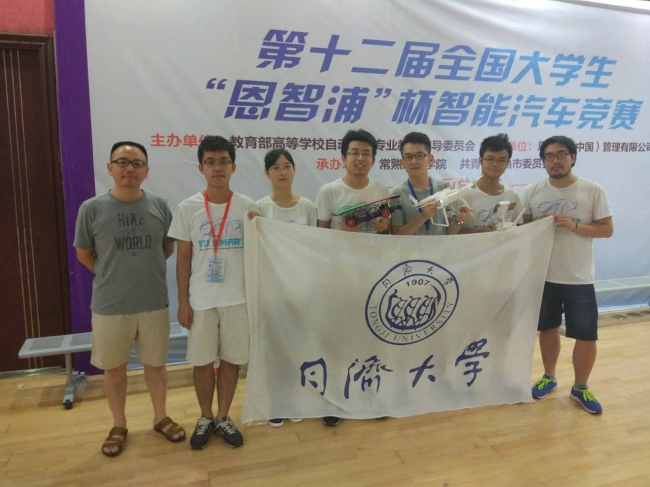 今年第十二届竞赛在继承原有赛制的基础上,新增设了四旋翼导航组、信标对抗组、电磁节能组等多个组别,丰富了竞赛形式,而竞赛规模的限制也使得竞争激烈程度更胜往年。经过华东赛区区赛以及全国总决赛300余支队伍的激烈角逐,由汽车学院杨秉文、曹铨辉、罗军、陈凯组成的“Das Los”队参加全国赛电磁追逐组并荣获全国一等奖的优异成绩。由汽车学院李秋键、杜博宇、陈贤钦、杨震宇、刘颖组成的“TUSmart队”在全国总决赛四旋翼导航组的激烈比赛中竭尽全力发挥出色,并最终获取创意奖。由电子与信息工程学院的同学组成的代表队也成功获得双车对抗组和光电四轮组的全国二等奖。