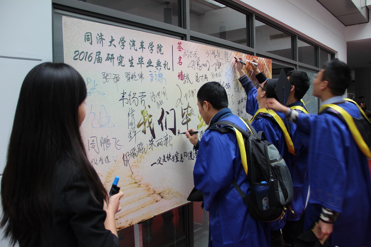 与此同时,汽车学院为每位2016届毕业生准备了特殊的毕业礼物——带有同济汽车元素的定制书签——希望同学们离开学校后仍能保持学习热情,不断用知识武装自己,勇攀人生高峰。而同学们为了感激母校的培育之情,也为学院献上了自己的答谢礼:捐一本书、种一棵樱花树、留下一本毕业纪念册、许下一个心愿、送一份特别礼。这份特别礼是由毕业生亲手制作的风铃,风铃阵阵,象征着离别时对同学的祝福和对母校的依恋,风铃上刻有毕业生姓名的小汽车挂件代表着2016届毕业研究生为汽车工业添砖加瓦的信心和抱负。