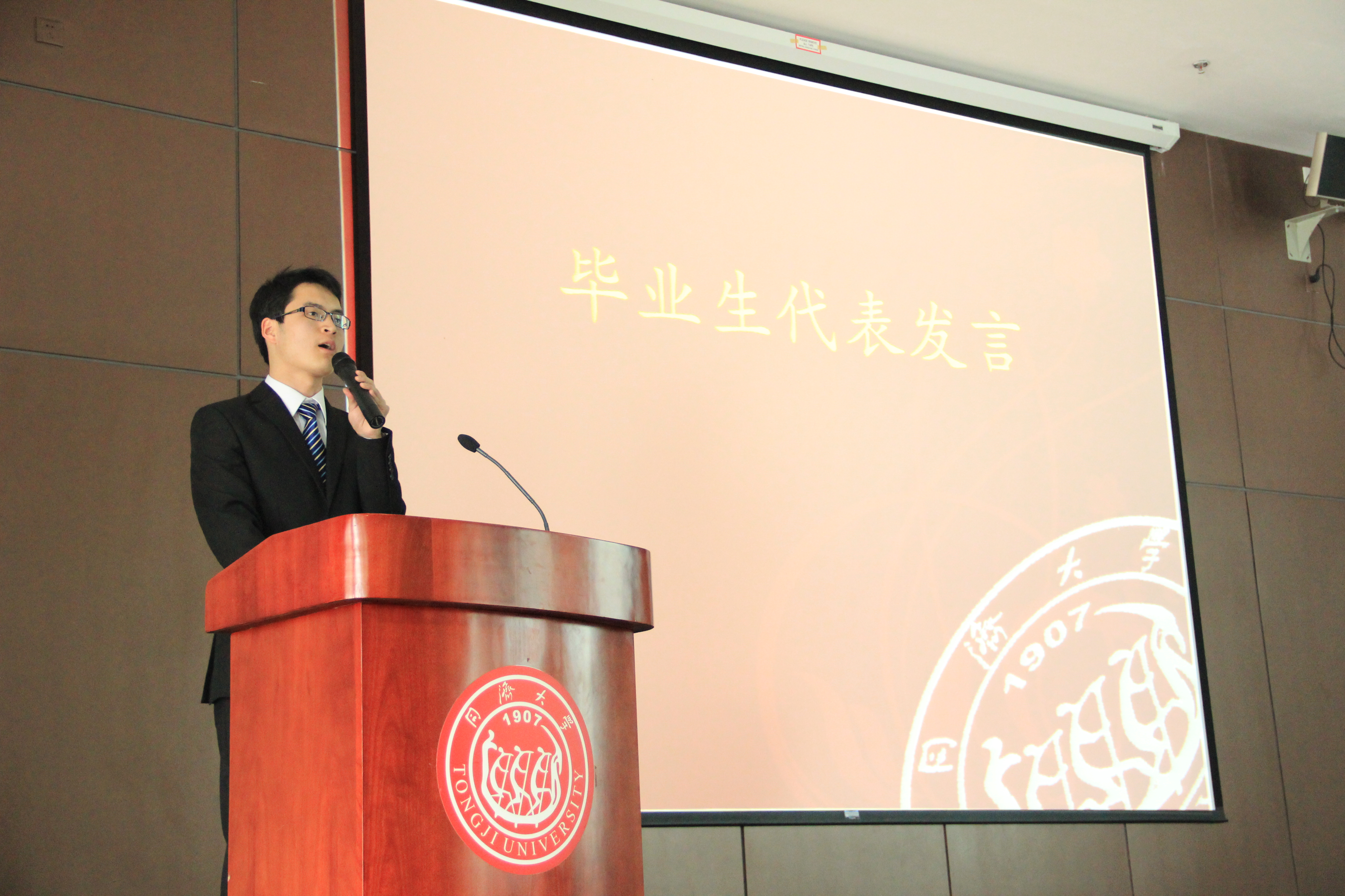 余卓平院长首先致辞,表达了对毕业生的殷切期望;陈翌书记宣读了本届上海市优秀毕业生和同济大学优秀毕业生名单,并与陆居怡老师、马钧老师、吴志军老师为优秀毕业生颁发了荣誉证书;随后,曹静老师详细介绍了本届研究生毕业去向及文明离校活动开展情况;毕业班班长曾旭作为学生代表,表达了毕业生对学校、学院由衷的感谢和留恋;陈慧老师作为教师代表,以“感恩,自律”为关键词表达了老师们对毕业生的深深祝福;张立军老师和魏学哲老师为6名校友联络人颁发了联络人证书,希望他们在今后成为校友与学校联系的纽带;最后,毕业生代表向学院赠送了亲手制作的毕业纪念册以及装满毕业生心愿的许愿瓶;全场师生及家长代表共同欣赏了毕业班的班级纪念视频,共同回味了两年半来大家共同度过的点点滴滴。