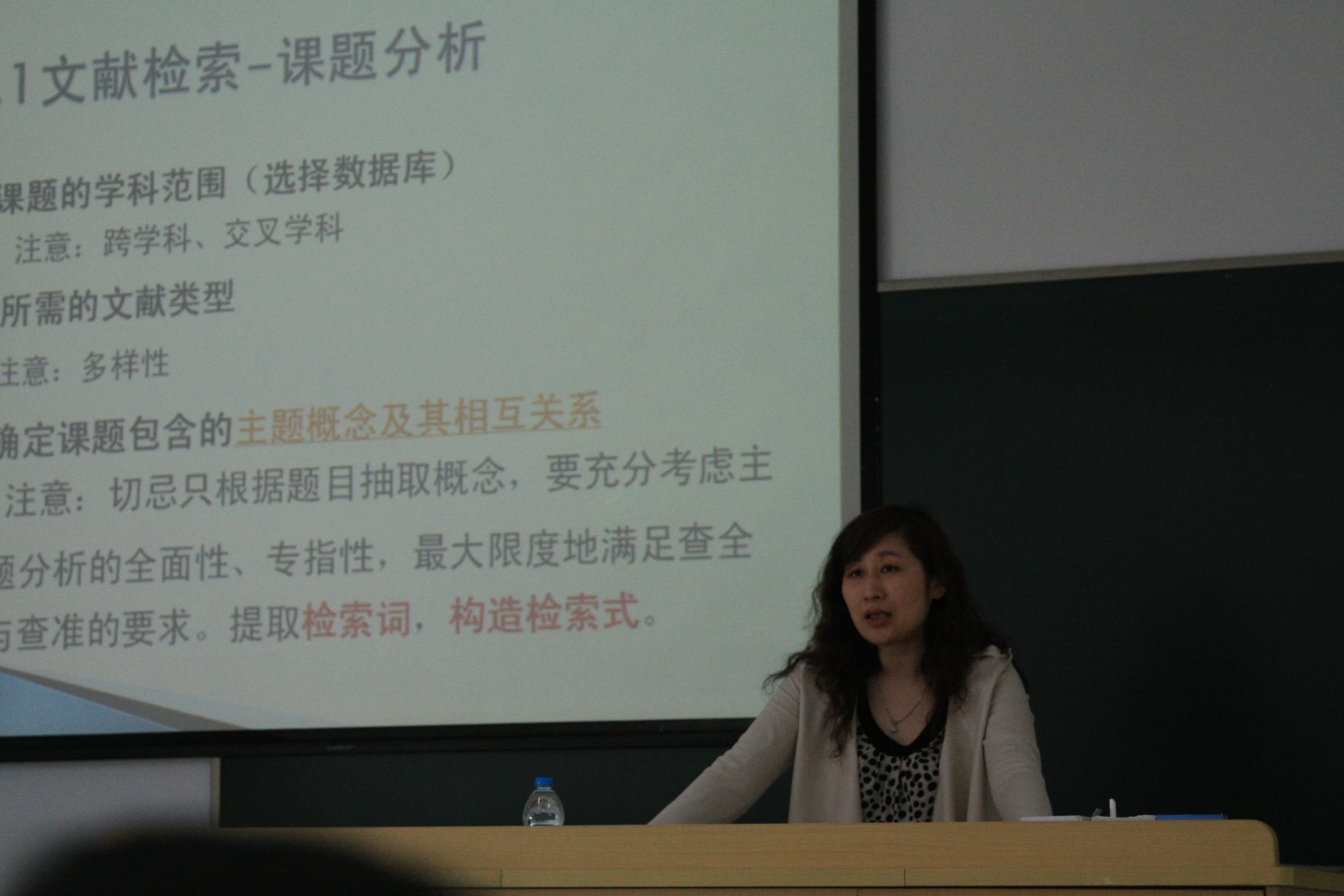 首先,袁老师从多方面展开了本次讲座。袁老师主要向同学们讲授了如何确立论文选题,如何进行文献检索,以及小论文具体的格式需求。当谈到如何选题时,袁老师说道:“我们选择的题目不在高端,而在于有新意和可行性,题目的选择还需与老师探讨从而完善构思。”袁老师强调,要在大量文献调研的基础上,才能去伪存真,去粗取精,推陈出新地开展具有自己特色的科学研究。袁老师还指出,选题要小,而查阅文献的范围要大,通过其他领域的文献检索和阅读,有助于发现新的研究视角,开阔研究思路,提高研究的有效性。在指导的过程中,袁老师还举出往届成功和失败的例子让同学们从中获取经验,吸取教训,争取写出令人满意的小论文。