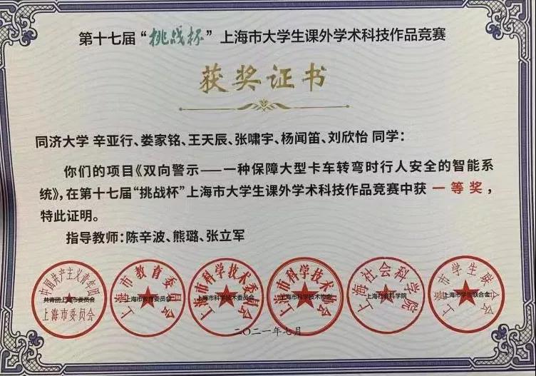 同济大学汽车学院大学生创新项目《双向警示——一种保障大型卡车转弯时行人安全的智能系统》荣获第十七届“挑战杯”上海市大学生课外学术科技作品竞赛一等奖。