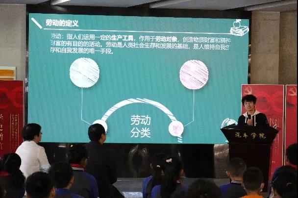 此次劳动育人主题教育活动共分为知识篇、实践篇及科创篇三个篇章。知识篇中,同济大学汽车学院学生党员代表王建昌同学及同济大学时代声音传播社的赵祉淇同学分别以“大手牵小手,劳动最光荣”“平凡劳动创造不平凡,志愿青春奉献新时代”为题进行了分享。两位同学生动形象地讲解了劳动的内涵、劳模精神和最美汽车人的事迹,分享了同济进博会小叶子、研究生支教团的故事。