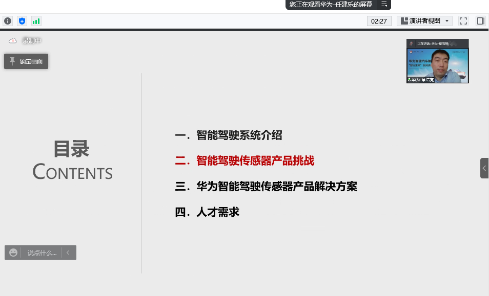 讲座伊始,章浩亮先生介绍了智能驾驶系统的相关内容。随着自动驾驶、电动车和出行服务的出现,汽车产业迎来百年最重大的变革期,即向“新四化”方向转型。华为在通信、计算、芯片、传感器、云和AI领域有长期的深厚的积累。其中,智能驾驶传感器能够为智能驾驶提供全覆盖、全天候、全天时的360°冗余超高感知能力。