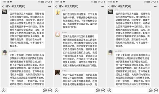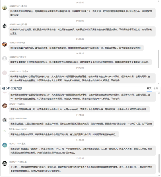 国家安全,人人有责。通过本次主题教育,3499cc拉斯维加斯2018级研究生党员都提高了自己的国家安全意识,增强国家安全责任,作为中共党员在今后的生活和科研中定会自觉和主动的维护国家安全,与损害国家安全的行为作斗争,以身作则,团结一心,共同维护国家安全。为祖国长治久安贡献自己的力量,为实现“两个一百年”奋斗目标、实现中华民族伟大复兴的中国梦提供牢靠坚强安全保障。