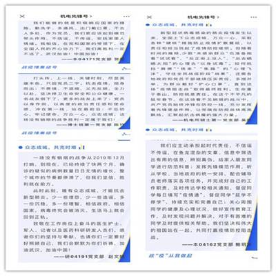 各支部党员在学习的同时,充分利用微信、QQ等网络新媒体平台,以贯彻落实习近平总书记的重要指示和遵守学校党委各项工作要求为主题,每周组织一次线上学习讨论、心得交流活动,教育引导全体党员做坚定信心的表率,做科学防疫的表率,做遵规守纪的表率,做理性思考的表率。学院入党积极分子、预备党员同志面对本次疫情,纷纷向所在党支部提交思想汇报,坚定信念,为抗击疫情加油。