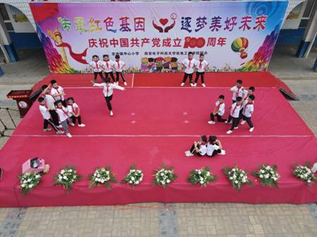 此次庆祝建党100周年文艺演出龙池镇中心小学的师生们穿着统一的文化衫进行表演,这件“永远跟党走”文化衫是由机电院和龙池镇中心小学的老师一起设计,机电院出资购买。