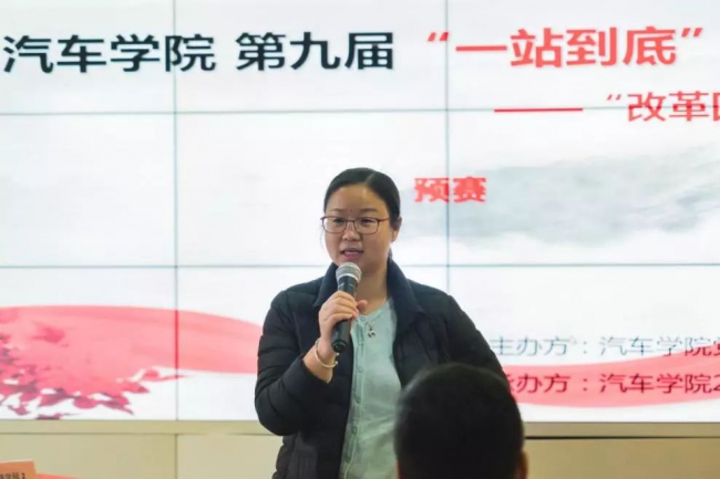 汽车学院党委副书记李红老师,党委组织员王婧如老师,学工办房亮老师、刘向老师、丁大增老师、杨正宇老师以及汽车学院各支部书记、党员代表出席了本次比赛。李老师首先介绍了本次“改革四十年”一站到底知识竞赛的开展背景,分享了自己对改革开放四十年历程的认识与理解,并鼓励选手在比赛中展现自我风采,取得优异的成绩。