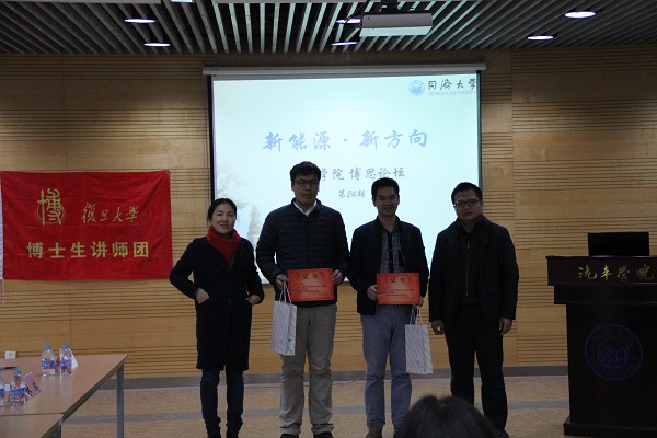 2017年1月4日下午,由研究生院和党委研究生工作部主办、汽车学院2016级博士支部承办的同济大学汽车学院第二十四期“博思”论坛在汽车学院A311正式拉开帷幕,本次“博思”论坛的主题为“新能源·新方向”。论坛邀请到复旦大学环境科学与工程专业博士生张成和同济大学动力机械与工程专业博士生徐宁作为演讲嘉宾,同时邀请到了汽车学院林瑞教授、常国峰副教授作为点评嘉宾,汽车学院党委史成宇老师和学工办葛畅老师作为特约嘉宾出席。