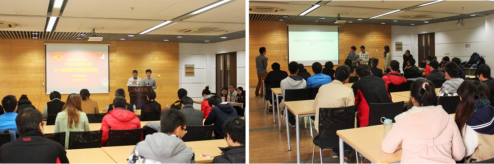 半决赛过程中,8支代表队通过抽签分成4组,每组分别决出获胜者进入决赛。比赛过程中,两位主持人专业负责、言语幽默,参赛的选手也表现出色,比赛有条不紊,现场气氛活跃,穿插其中的音频题缓解了参赛队员答题的紧张情绪,活跃了现场观众的气氛。经过组内对阵,电信学院本科第八支部、机械与能源工程学院本科第六支部、汽车学院2012级本科支部、汽车学院2013级专硕联队胜出,进入最终的决赛。