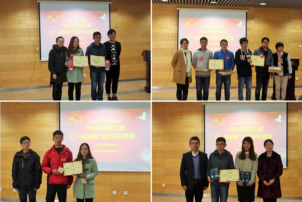 2015年12月22日,同济大学汽车学院“一站到底”党史知识竞赛半决赛、决赛在汽车学院宁远馆A311顺利举行!“一站到底”知识竞赛作为汽车学院一年一度全院学生党员的重要传统活动之一,迄今已连续举办五届。竞赛由汽车学院党委主办,汽车学院2012级本科支部承办。汽车学院党委副书记史成宇老师、电信学院学生党总支副书记王晶晶老师、机械与能源工程学院钱偲老师、汽车学院党委何伟君老师、汽车学院学工办副主任葛畅老师、郑晶晶老师、曹卢老师、张燕老师出席了活动。