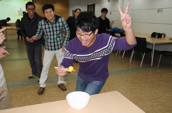 积分落后的“A_one”队很快迎来了扳平比分的机会。游戏“千里传珠”要求每组队员依次站成一排,从第一个组员开始进行转圈,第一个组员转完后,第二个开始转圈,依次每人转5圈,第一个人完成转圈后,立即用筷子夹起水中的乒乓球,须在第二人完成转圈后,将其传到第二个人手中,依次传到终点盆中。总分落后的“A_one”队知耻后勇,充分讨论游戏战术,默契配合,迅速完成了全部3枚乒乓球的传递,顺利在本轮扳回一城,并将总积分带到了4:4。