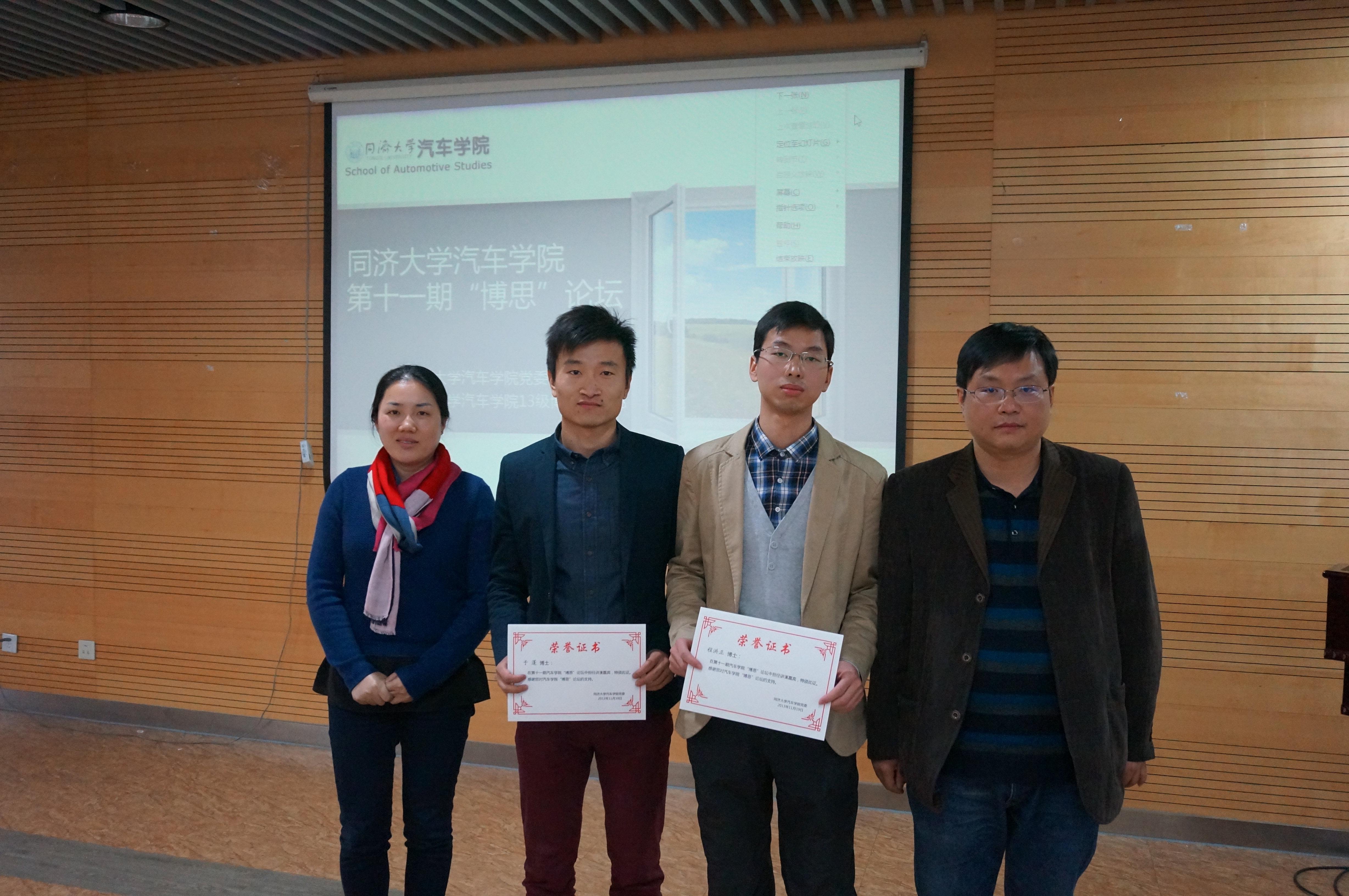 2013年11月19日下午,由汽车学院党委主办,汽车学院13级博士支部承办的第十一期“博思”论坛在汽车学院A311正式拉开帷幕。本期“博思”论坛经过前期的博士生报名及博士生导师遴选,最终选出11级博士于蓬和13级博士程洪正作为主讲人,汽车学院博士生导师林瑞教授、赵治国副教授作为点评嘉宾出席本期论坛。