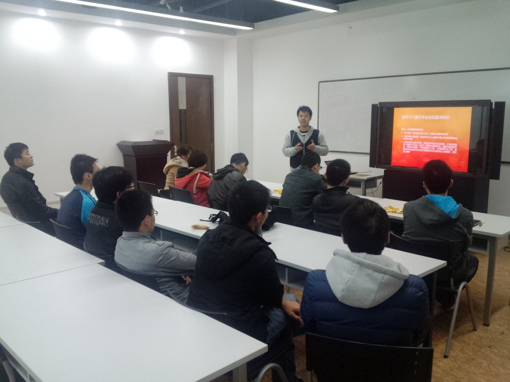 支部书记孙晨乐首先向支部成员介绍了有关党的三中全会的政治常识,包括参会的人员、召开的流程、公报的发布、精神的传达等。随后对十八届三中全会公报以简明概括的形式将其精神向支部成员逐条进行了传达,并梳理了改革开放以来中央政策的演进过程。