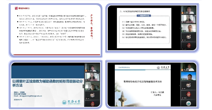 2020年6月20日中午12:30,同济大学汽车学院第35期博思论坛分论坛二“科研杂货铺”在线上举行。论坛主题为“论文写作与术业专攻”,论坛邀请到同济大学汽车学院博士生宋震、邓国明和吴志鹏作为演讲嘉宾。根据嘉宾的研究内容,参会同学自主选择对应的研讨小组,并结合宣传手册对所有嘉宾的演讲内容提前预习。从学术论文写作到研究成果分享,这是一次内容丰富而形式特别的学术交流活动。本次活动由研究生第十党支部书记刘盼学同学主持,汽车学院学生办公室主任方璐老师和汽车学院辅导员刘向老师作为嘉宾出席。