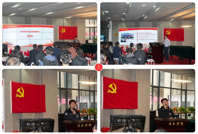汽车学院科技创新基地党支部教师党员宋珂、学生党员陈安祥,同济电车队队员张旭分别做了主题分享,他们重新回顾了车队发展的历程和2020年中国赛的点点滴滴,表示将牢记肩上的使命,把创新精神、奋斗精神继续传承发扬。