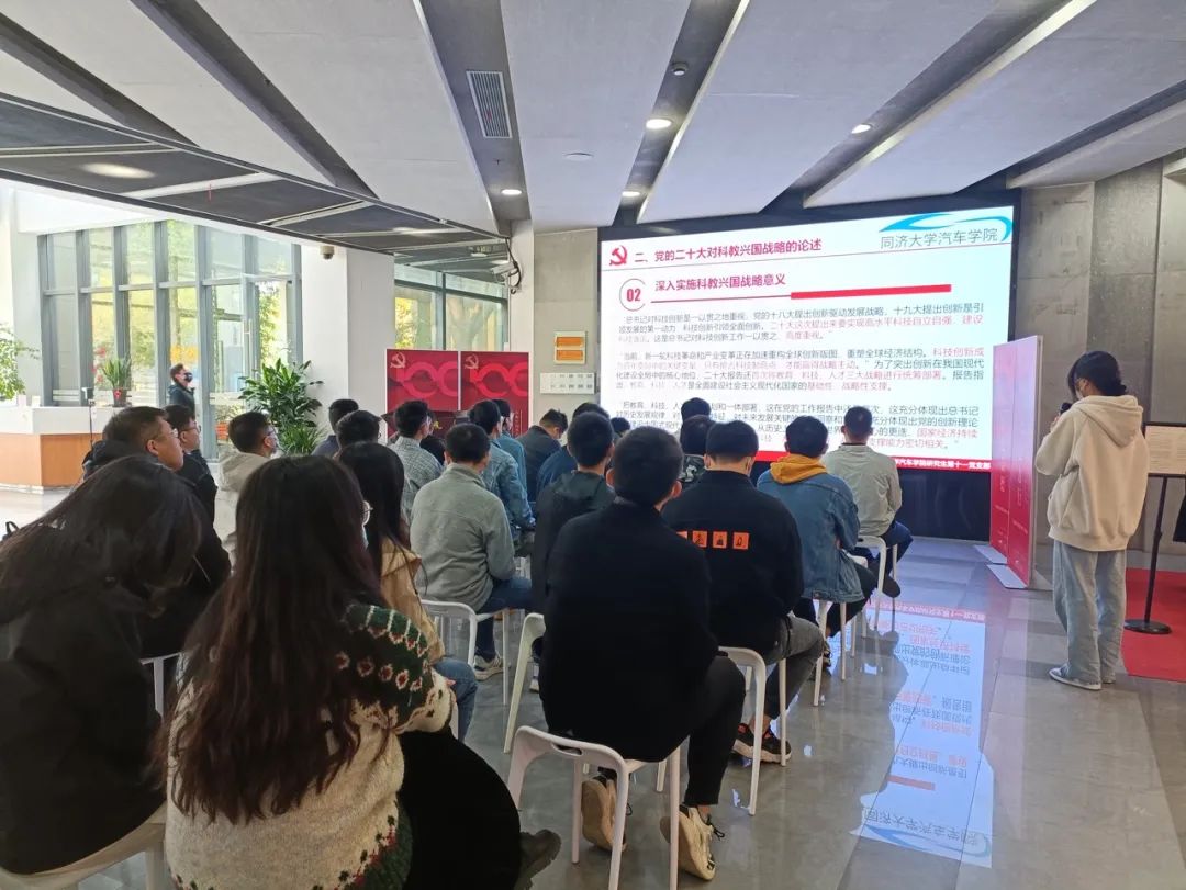 首先,由研究生第十一党支部的陈雅娟同志带来题为“科技托起强国梦”的分享。分享主要围绕中国共产党第二十次全国代表大会中有关科教兴国的论述,回顾了科创兴国战略的发展历程,总结了科创兴国战略成就,强调了汽车青年更应在专业领域追求卓越,增强自主创新能力,为深入实施科创兴国战略、建设科技强国而不断奋斗。