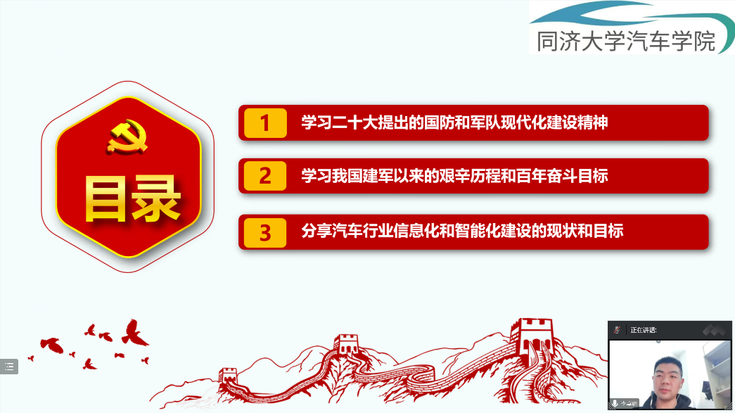首先,由研究生第九党支部洪泽和李卓明同志带来主题为“学习党的二十大会议精神,助力国家现代化军队建设”的理论知识分享。本次分析重点学习了党的二十大报告中对国防和军队现代化建设的论述,回顾我国国防和军队建设的伟大成就。同时强调了经济发展与科技进步对国防和军队现代化建设的重大作用,鼓励广大汽车青年要积极参与到国防科技进步的事业中,为保障人民的生命财产安全贡献自己的力量。分享结束后,张智明老师补充了汽车学院在国家军事工业项目中的重要贡献。