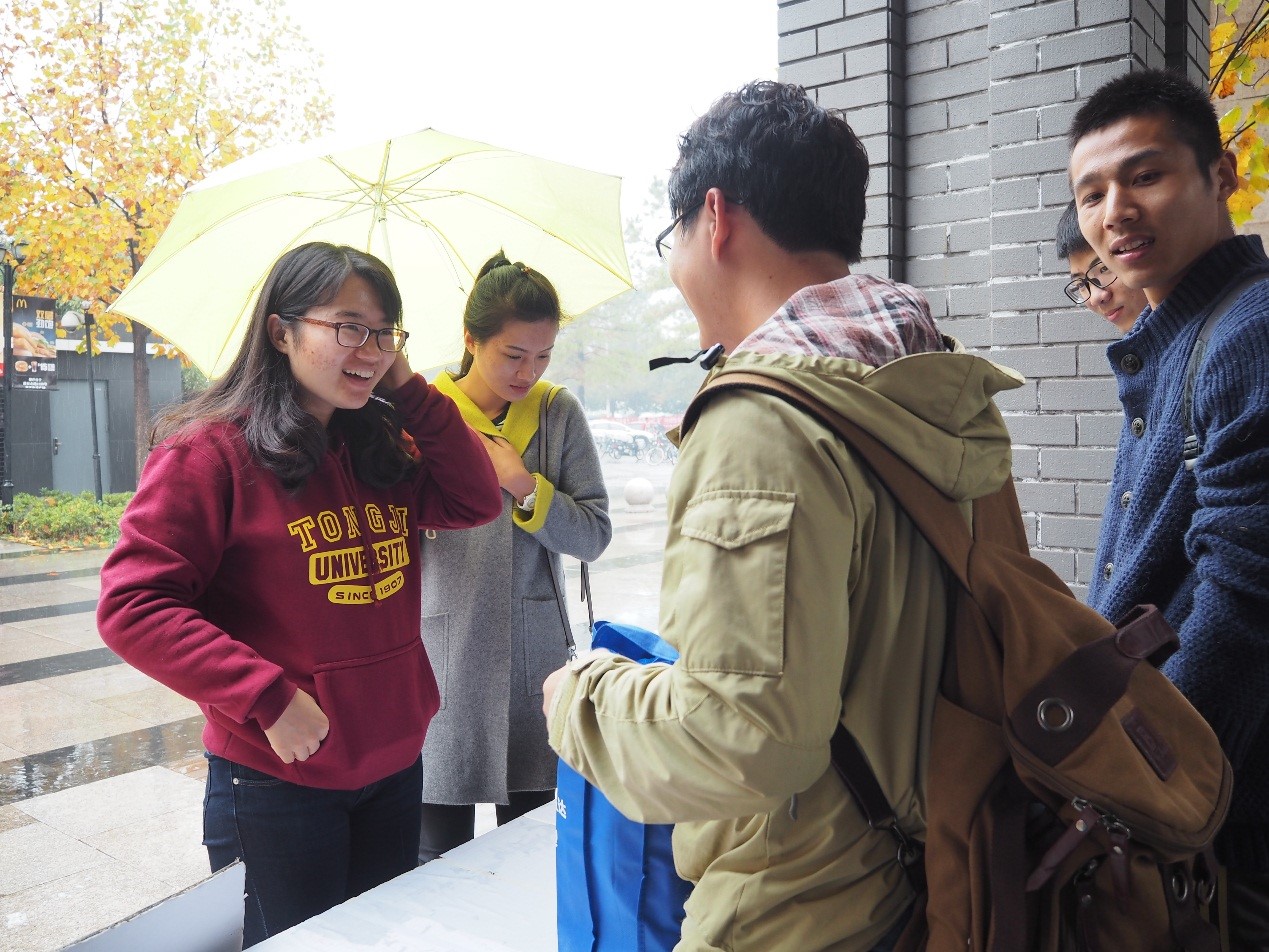 随着时间的推移,吃过中饭路过展区的同学也越聚越多,我们也开始宣传汽车学院的两个微信公共平台,关注的同学便可以得到精美礼品,包括精美水杯、汽院·嘉定十年明信片以及神秘彩蛋。同学们似乎对奖品很感兴趣,尤其对于彩蛋内的物品十分好奇,便参与进我们的活动:纷纷拿出手机关注我们的同济大学汽车学院官方微信(微信号:tongjiauto)。相信大家会通过微信平台了解更多学院新闻以及学院风采。