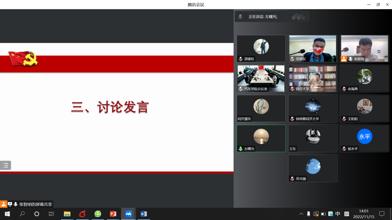 张智明首先介绍支部学习贯彻党的二十大精神情况,支部通过召开二十大精神学习动员会、集中学习二十大报告、开展“同车行”政治理论学习、党委委员讲党课等形式进行了一系列专题学习,并积极参加了学院党委组织的党支部书记集中学习、党委特邀报告等,深入学习领会党的二十大精神。